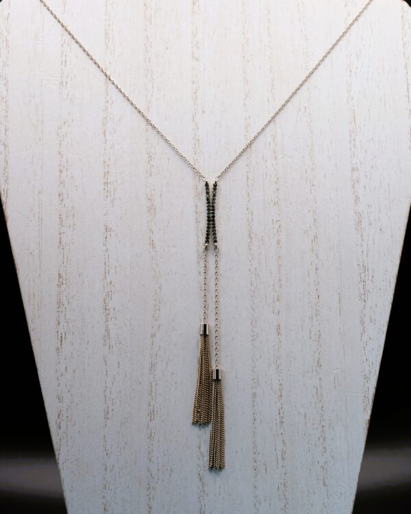 Silver colour Crystal gemstone inlaid bars supporting wire tassels pendant necklace. |